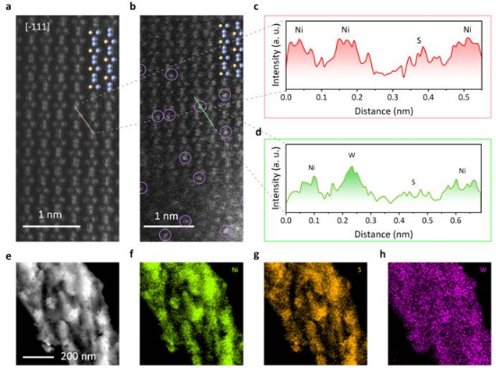 在众多析氧催化剂中,Ni3S2是一种重要的材料。钟文武教授团队创新性地提出一种同时调控Ni3S2中Ni原子局域能带结构及电子自旋状态的方案。W原子和S空位的共同掺杂提升了d带中心的同时,通过元素之间的电荷转移优化了eg电子数,从而良好地平衡了对*O和*OOH的吸附,使Ni3S2的析氧活性有了巨大提高。在100 mA cm-2的电流密度下,优化后的Ni3S2的过电位仅为246 mV,Tafel斜率为66 mV dec-1。