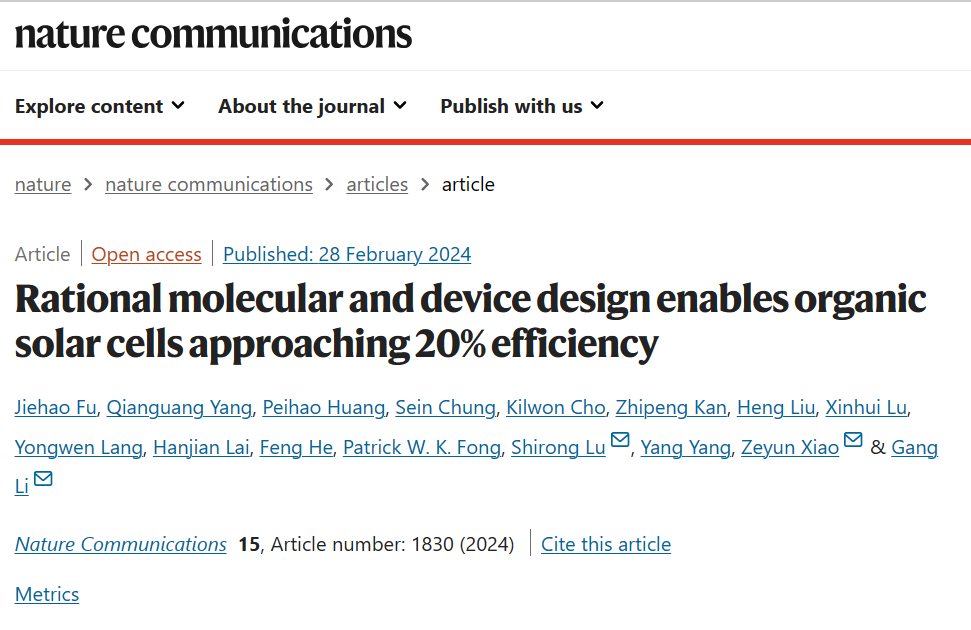 近日,材料科学与工程学院陆仕荣团队联合香港理工大学、中国科学院重庆绿色智能技术研究院,基于光伏材料结构创新,在有机太阳能电池领域取得突破性进展,再次刷新单节有机太阳能电池世界最高效率记录。此成果“Rational molecular and device design enables organic solar cells approaching 20% efficiency”发表在《Nature Communications》上。陆仕荣研究员、李刚教授、肖泽云研究员为该论文的共同通讯作者,杨乾广老师和付杰浩博士为该论文的共同第一作者。