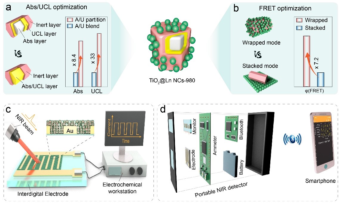 图1. (a-b)TiO2@Ln NCs-980纳米组装体的制备与性能优化;(c-d)TiO2@Ln NCs-980基窄带近红外探测电极与便携式探测器示意图。