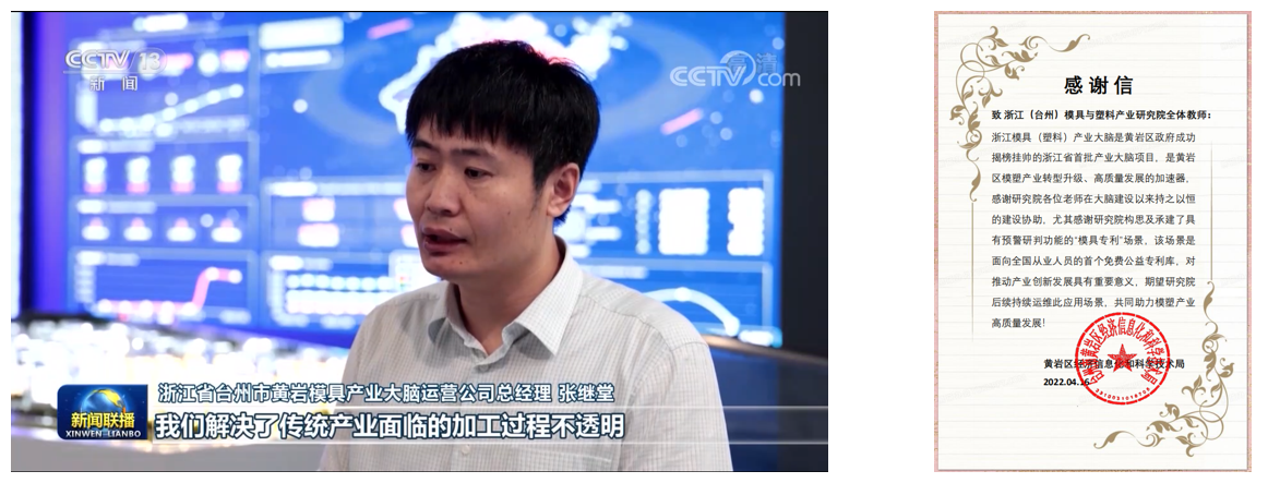 (2)将专业能力融入政府管理中,创新服务模式。依靠科技小分队成员在模具设计制造、新材料、数字技术等领域的专业能力,协助黄岩区开展省经信厅立项的“黄岩模具产业集群新智造试点”及“浙江模具(塑料)产业大脑”项目建设,助力模具大脑获得市首批“最佳应用”,并获得央视一套“新闻联播”、浙江卫视等媒体报道肯定;协助区检察院建立模法服务应用场景、帮助区工商联建立行业标准,工作成效得到相关部门以“感谢信”形式充分肯定。
