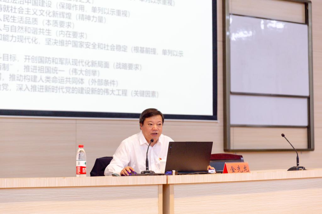 金先龙以“以中国式现代化全面推进中华民族伟大复兴—学习贯彻党的二十大精神”为题,从过去五年和新时代十年的伟大变革、当前复杂的国内外形势、新征程的中心任务、报告中引人关注的新论断新战略新举措、如何深入推进新时代党的建设伟大工程、怎样学习贯彻落实党的二十大精神等六个方面,对党的二十大精神进行了系统深入的解读。金先龙寄语广大青年教师和学生,当代中国青年生逢其时,施展才干的舞台无比广阔,实现梦想的前景无比光明。广大青年要坚定不移听党话、跟党走,做有理想、敢担当、能吃苦、肯奋斗的新时代好青年。