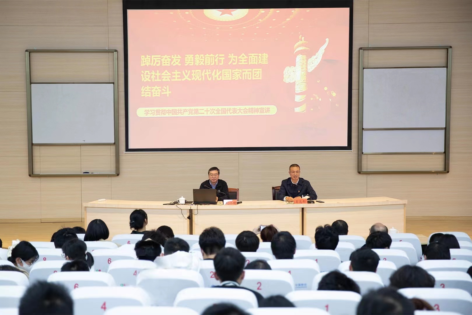 11月24日,校党委委员、副校长赵小明到材料学院宣讲党的二十大精神。学院党总支副书记吴高都主持,学院党政领导、师生代表共300余人参加宣讲会。