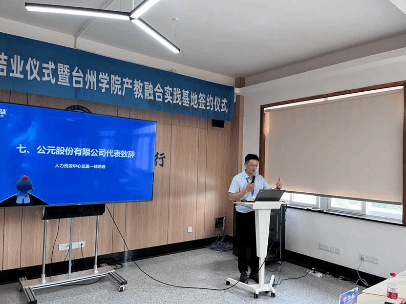 副院长戴晟在致辞中对公元股份为学院提供校外实践支撑表示感谢。他表示,台州学院作为我市唯一的应用型本科高校,坚持以“命运共同体、利益共同体、奋斗共同体”理念为引领,学科专业紧密对接区域经济发展,大力推进产教融合,提升人才培养质量。希望以此次产教融合基地落地为契机,进一步加强校企之间的合作与交流,实现互利共赢。