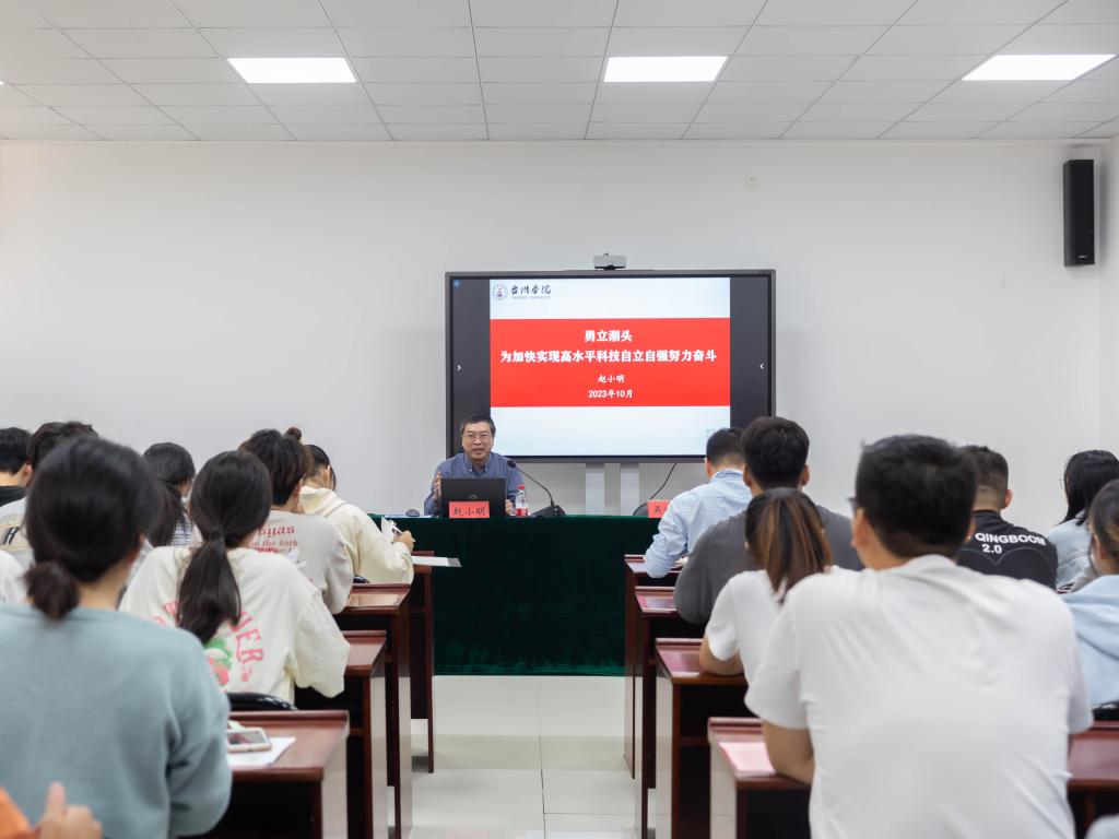赵小明从习近平总书记关于科技自立自强的重要论述、全面了解高水平科技自立自强的内涵、习近平总书记对浙江的期望与要求、浙江在行动、台州学院有作为等五个方面深入阐述了高水平科技自立自强的内涵和意义,强调要进一步强化教育、科技、人才一体化发展理念,充分发挥高校在人才培养、基础研究、技术研发等前端领域不可替代的比较优势。一是以科技创新推动学科建设,优化学科发展规划,形成以一流学科为引领的学科体系;二是以科技创新引领社会服务,坚持台州学院姓“台州”,全力打造校城“三个共同体”理念,以“能级平台群”助力创新驱动,强化有组织科研,建好科研团队,持续推进“1139科技小分队”;三是以科技创新推动特色强校,聚焦“315”科技创新体系15个重点领域,整合优势资源,构筑大平台、凝聚大团队、推动大交叉,承担大项目、撬动大合作。