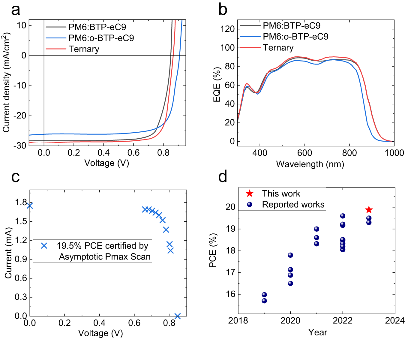近年来,得益于新型吸光材料的开发,具有轻、薄、柔特性的有机太阳能电池取得了飞速发展。为了突破有机太阳能电池的效率瓶颈,需要进一步降低电池的能量损失,同时保证高效的吸光和电荷传输特性。在高效二元体系中引入第三组分是常用的提升有机太阳能电池效率的方法,但是如何选取合适的第三组分是研究人员需要面对的难题,因为第三组分需要满足多个关键要求,包括低的电荷转移态-带隙差、高介电常数、合适的表面能与结晶性等。在本工作中,研究团队系统性地研究了第三组分的设计规则。基于理论计算,通过调控端基卤代位置,设计合成了一种新型非富勒烯受体o-BTP-eC9。得益于电荷转移状态的提升,o-BTP-eC9显著降低了有机太阳能电池的能量损失。此外,新的受体与宿主受体BTP-eC9具有优异的混溶性、结晶和能级兼容性,使得基于PM6:BTP-eC9:o-BTP-eC9的三元体系的效率达到19.9% (第三方权威机构认证为19.5%),再次刷新单节有机太阳能电池世界最高效率记录。