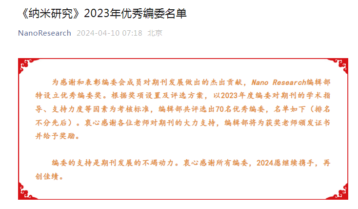 近日,材料领域知名期刊《Nano Research》(《纳米研究》)公布了2023年优秀编委名单,材料科学与工程学院钟文武教授获此荣誉。该名单由期刊编辑部根据2023年度编委对期刊的学术指导、支持力度等考核因素评出,包括来自清华大学、中国科学院、国家纳米科学中心等知名高校和科研机构的70名优秀编委。