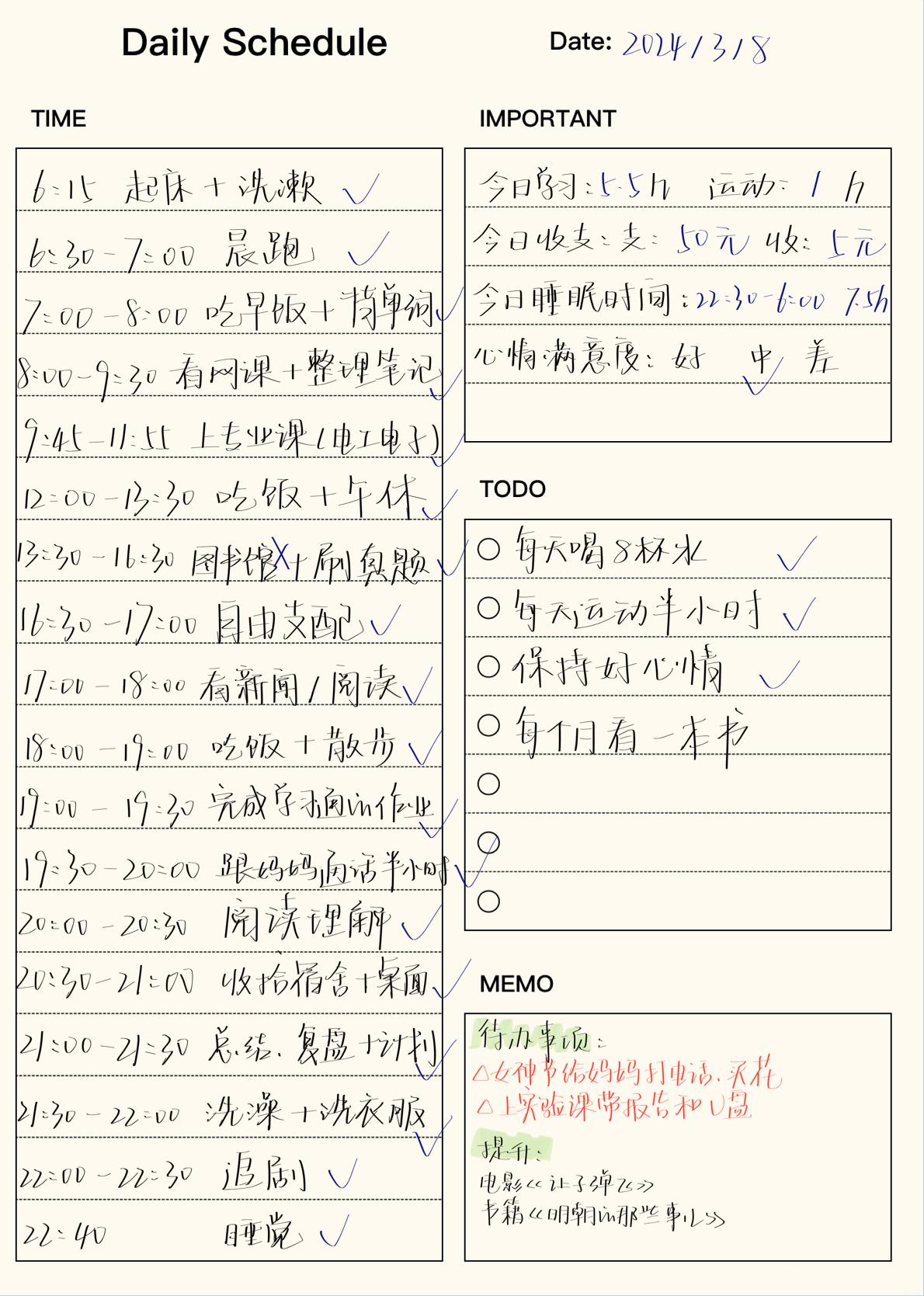真正的自由是在所有时候都能控制自己。通过有效的时间管理,可以充分实现自律。学习是一件与时间较量的长久战,那些看似不起波澜的日复一日,会在某天让你看到坚持的意义。
