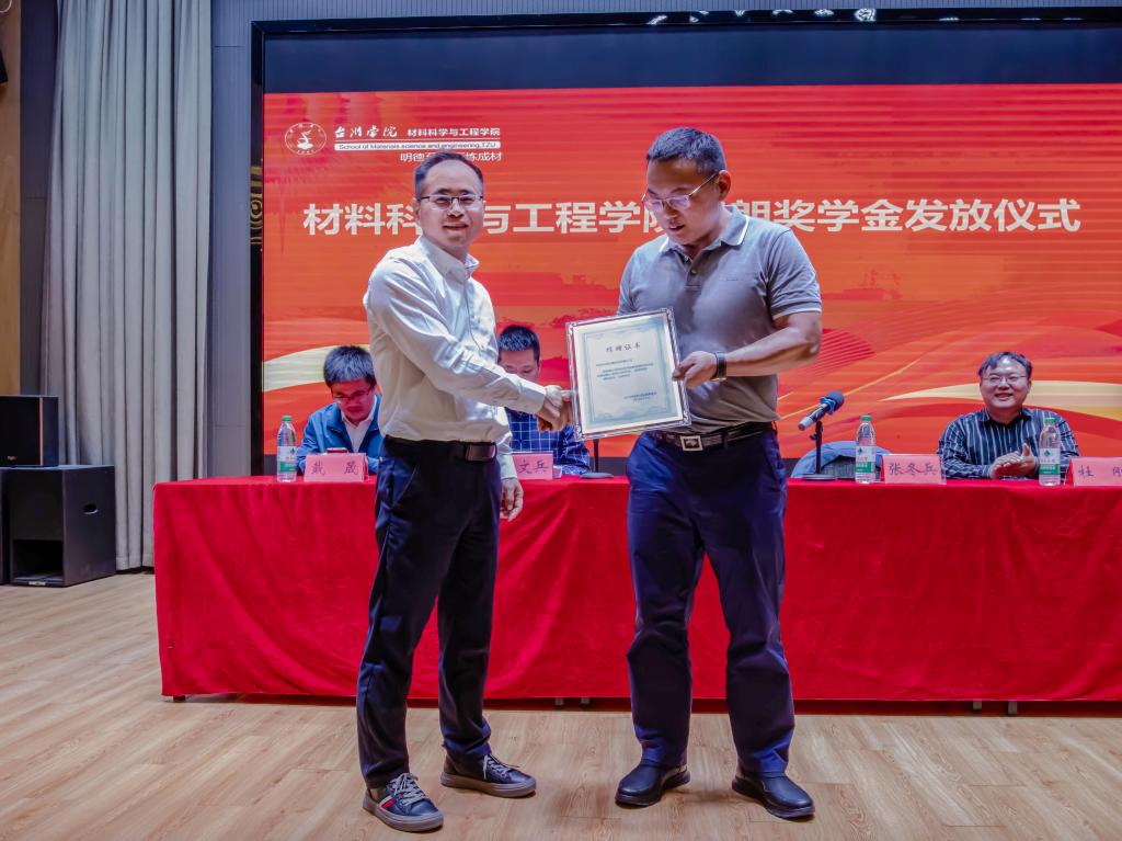 在热烈的掌声中,吴建波代表学院向杭州天朗金属科技有限公司授予了捐赠证书,以表达学院对企业的诚挚感谢和崇高敬意。