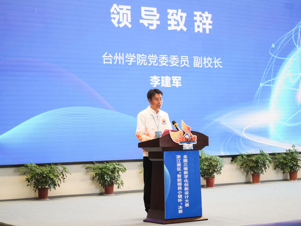 李建军代表学校致开幕词,他对大赛的启幕表示热烈祝贺并预祝大赛圆满成功。他表示,近年来,台州学院始终坚持将大学生创新创业与学校事业高质量发展有机融合,围绕创新发展战略,大力推进政产学研一体化建设,学科专业布局紧密对接区域经济发展,将创新创业教育融入人才培养全过程,大力培养具有“家国情怀、垦荒之志、扎实本领”的高素质应用型人才。学校再次携手黄岩智能模具小镇,必将全力以赴、深入细致做好大赛各项服务保障工作。