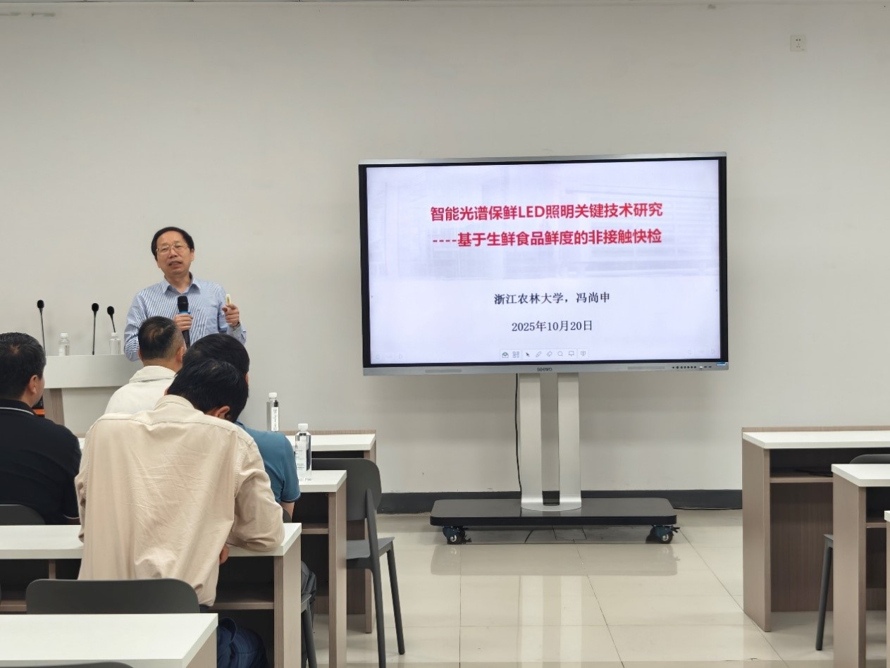 报告中,冯尚申教授精准聚焦生鲜食品保鲜领域的核心挑战与行业痛点,一方面深入剖析了传统检测技术存在的破坏性强、耗时久、无法实时监控等突出弊端,另一方面紧密结合消费者对生鲜食品 “新鲜、安全、便捷” 的迫切需求,创新性地提出了智能光谱保鲜 LED 照明关键技术研究方向。该技术实现了双重突破:既能以 “非接触” 方式精准判定食品新鲜度,又能通过技术干预 “主动” 延长生鲜食品保鲜周期,有效破解了传统技术的局限。同时,冯教授详细阐述了 “感知-决策-执行” 的技术构想,明确了将系统集成后从实验室研发推向实际应用场景的实施路径。此项技术的落地,不仅能为食品安全监管提供强有力的技术支撑与装备保障,更将进一步提升公众对食品质量安全的信任度,为生鲜食品行业高质量发展注入新动能。