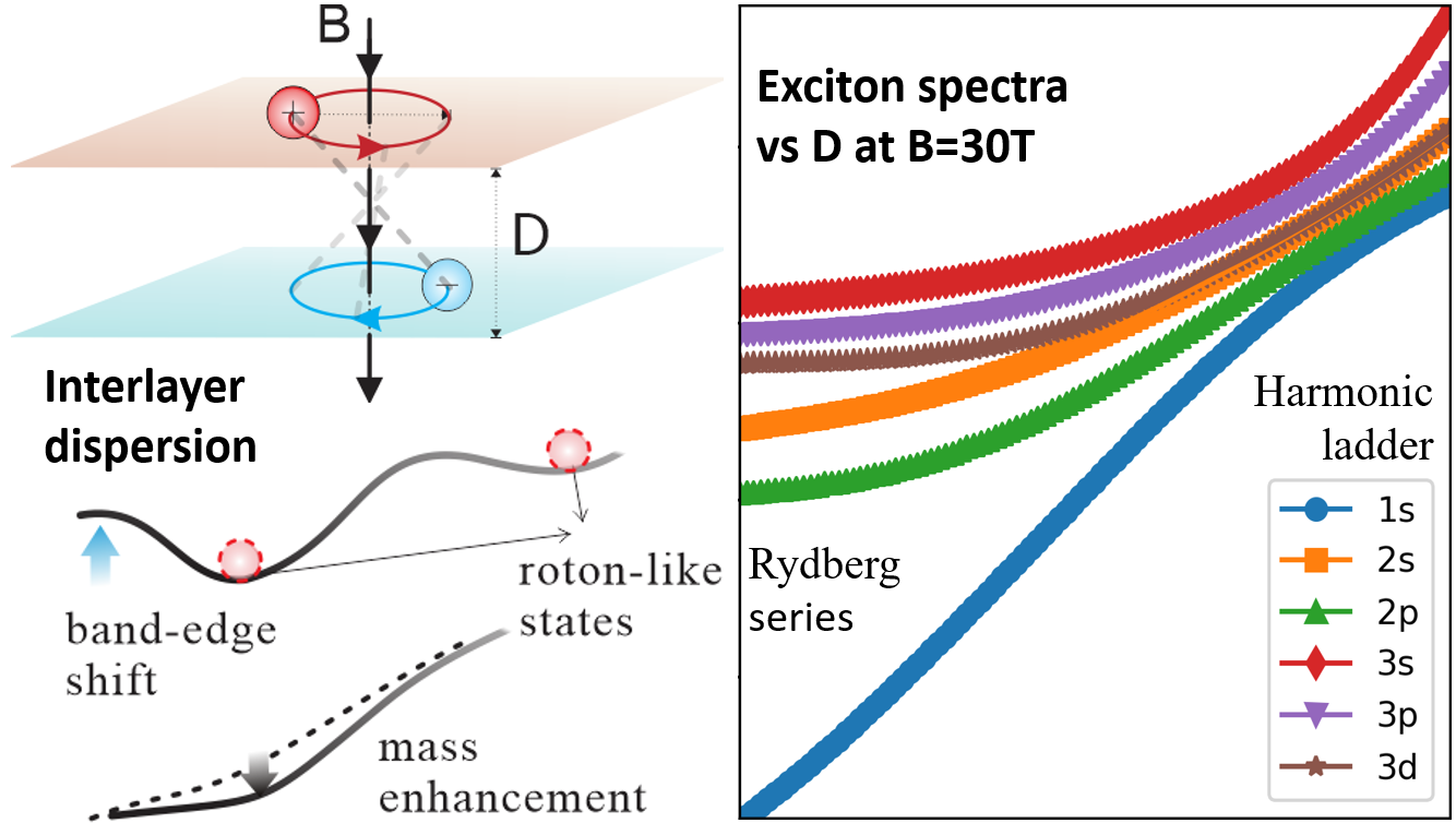 磁场对层间激子的调控(左)与磁能谱随层厚变化(右)