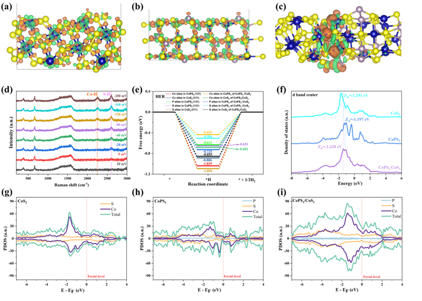 该论文通过简便的溶剂热和磷化工艺合成了CoPS3/CoS2异质结HER电催化剂。经过研究发现在这些异质界面处存在显著的应力效应,导致了晶格畸变和更多活性位点的暴露。并且界面间相互作用还改变了催化剂的电子结构,提高了其导电性和氢吸附能力,且催化剂的过电位仅为36.3 mV (@10 mA cm-2),优于已报道的同类催化剂。经过原位拉曼表征和DFT理论分析发现活性位点为CoPS3一侧的Co位点,这充分表明了过渡金属硫代磷酸盐的催化潜力。